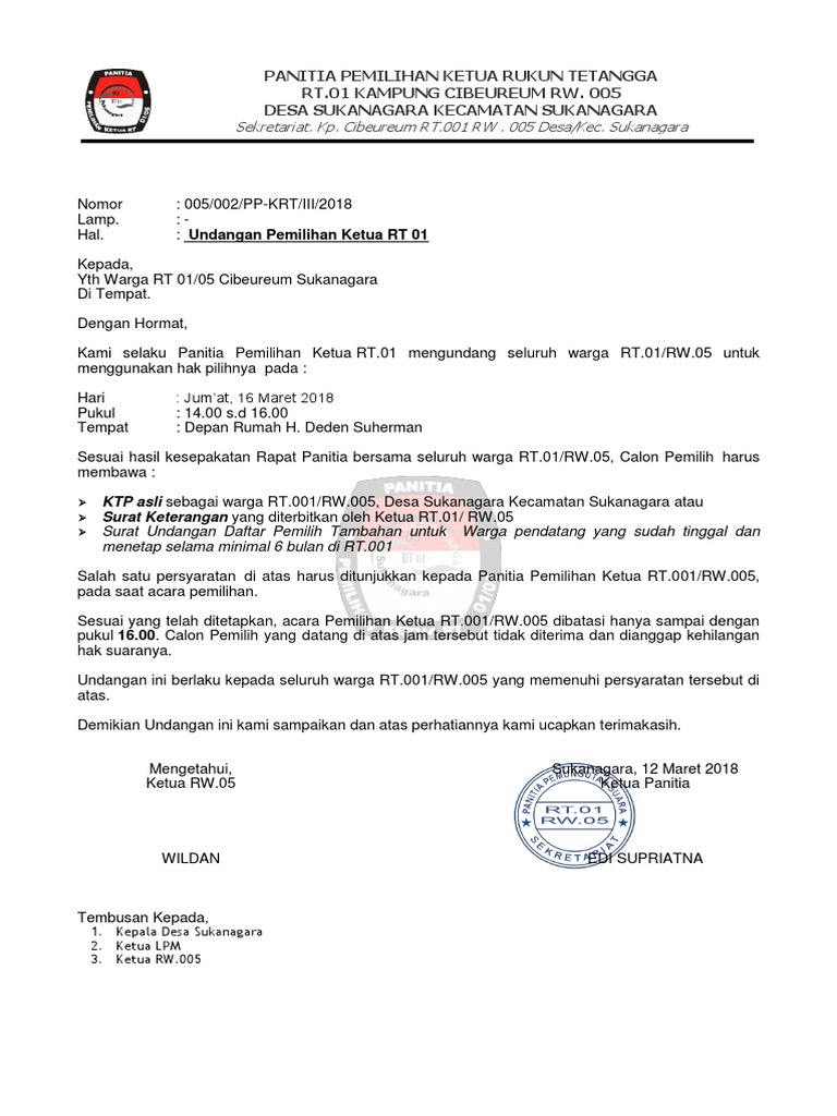 Contoh surat undangan pemilihan ketua rt rw untuk menghadirkan warga atau pemegang hak suara pada tps dengan waktu dan tempat yang tertera jelas diundangan. Semoga apa yang kami bagikan pada kesempatan ini bermanfaat ya sobat. Kami mengundang seluruh warga kampung baru untuk menghadiri rapat pada: Download undangan karang taruna doc (word) anda membutuhkan file undangan dalam format word? Pengajuan kandidat calon ketua rt 04. Dibawah ini ada contoh surat undangan pencoblosan untuk calon ketua rt atau ketua rw yang bisa anda gunakan. Sipin di kepala keluarga/yang mewakili tempat di rt 01 simpang iii sipin dengan ini kami harapkan kehadiran bapak lurah simpang iii sipin di rt 01. Undangan tamu seperti ketua rw, kelapa dusun (kadus) dan juga pihak desa atau kepala desa adalah perlu, karena tanpa kehadiran mereka sepertinya acara pemilihan ketua rt. Doc berita acara pembentukan rukun warga risa rohman. Contoh surat undangan pemilihan rt by ypuriza. Contoh undangan pemilihan rt doc. They are so many great picture list that could become your inspiration and informational reason for contoh surat undangan pemilihan rt design ideas for your own collections. 21 contoh surat undangan resmi tidak resmi rapat pernikahan syukuran dll di 2020 surat undangan bersyukur.